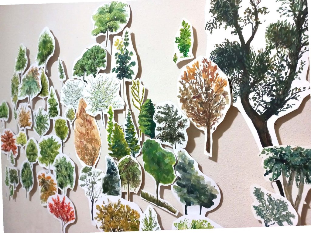 SenihaÜnay, “Manzaranın Yakınında Çok Uzakta”, kağıt üzerine yağlıboya, Düzce’de yok olan ağaçlardan oluşturulan orman, 2023
